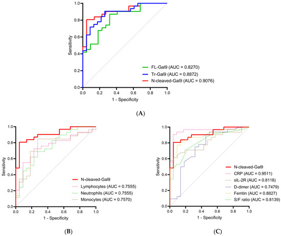 Receiver operating characteristics (ROC) curve for discriminating COVID-19 with mild symptoms from that with pneumonia (A–C). ROC curve and area under the curve (AUC) value for discriminating CV from CP of plasma N-cleaved-Gal9 were compared with those of (A) plasma FL-Gal9 and Tr-Gal9, and (B,C) specific pathological markers.