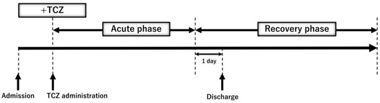 Definition of +TCZ, acute phase, and recovery phase during TCZ treatment in the study. +TCZ was defined as the period immediately before TCZ administration. The recovery phase was defined as the period from the day after TCZ administration to one day before discharge. The recovery phase was defined as the subsequent period.