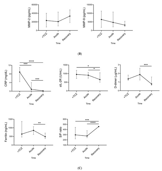 Time course of Gal-9, MMPs, and specific pathological markers during TCZ treatment (A–C). Changes of (A) plasma Gal-9, (B) plasma MMP-2 and MMP-9, and (C) specific pathological marker levels during TCZ treatments are shown. The median for each parameter in each phase is plotted with IQR. * p < 0.05, ** p < 0.01, *** p < 0.001, **** p < 0.0001.