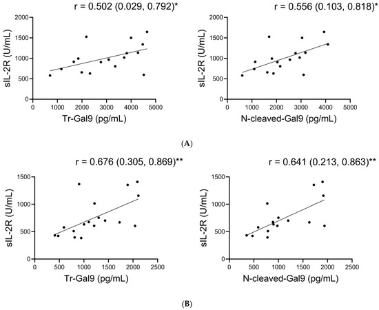 Correlations of Tr-Gal9 and N-cleaved-Gal9 with sIL-2R during TCZ treatments (A,B). Scatter plots show Spearman’s rank correlations of plasma Tr-Gal9 and N-cleaved-Gal9 levels with sIL-2R levels in (A) the period before TCZ treatments and (B) the recovery phase. r: correlation coefficient, ( ): 95% CI, * p < 0.05, ** p < 0.01.