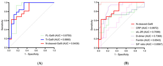 ROC curve for discriminating the period before TCZ administrations from the recovery phase (A,B). ROC curve and AUC value for discriminating the period immediately before TCZ administration from the recovery phase of plasma N-cleaved-Gal9 were compared with those of (A) plasma FL-Gal9 and Tr-Gal9 and (B) specific pathological markers.