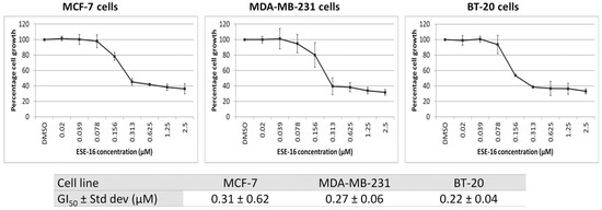 Dose-response curves revealed GI50 values of 0.31 ± 0.62 µM in MCF-7 cells, 0.27 ± 0.06 µM in MDA-MB-231 cells, and 0.22 ± 0.04 μM in BT-20 cells (Figure 1). These results indicated that cytotoxicity of ESE-16 was independant of cell receptor status.