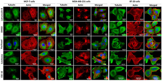 Similar to 2-ME, ESE-16 binds to the colchicine-binding site on tubulin and depolymerizes intracellular microtubules in a dose-dependent manner [19,26]. Microtubule abrogation subsequently induces a G2/M phase block as a result of activation of the spindle assembly checkpoint [19,28]. Fluorescent microscopy was used in the current study to visualize the microtubule and actin anatomy in MCF-7, MDA-MB-231, and BT-20 cells exposed to ESE-16 for 24 h. Cells displayed depolymerized microtubule networks as well as disrupted actin morphology. Cell migration, as well as cell division, is facilitated by reorganization of the cellular cytoskeleton. Polymerization of the actin skeleton is partially responsible for cell movement and adhesion, and it is regulated by leading and trailing edge regulating proteins trafficked by microtubules [37,38].