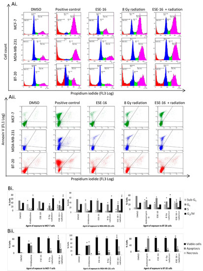 Cell cycle and Annexin V-FITC analysis of cells exposed to the various treatment modalities. (A). Cell cycle modifications were visualized by plotting cell counts against propidium iodide (Ai), whereas apoptosis was visualized by plotting annexin V-FITC against propidium iodide (bottom left corner: viable cells; top left and right quadrants: apoptotic cells; bottom right quadrant: necrotic cells.) (Aii). Cells were exposed to ESE-16 and 8 Gy radiation as experimental controls and compared to the combination treatment. (B). Graphical representation of cell cycle analysis (Bi) indicated that irradiated cells pre-treated with ESE-16 displayed a significant increase in the G2/M phase population with a concurrent decrease in the G1 phase population compared to DMSO and compound controls. MCF-7 cells displayed a significant increase of the sub-G1 population in the ESE-16/radiation samples when compared to both experimental controls. (Bii). Graphical representation of annexin V-FITC quantification in cells exposed to various treatment conditions. BT-20 cells exposed to ESE-16 before 8 Gy radiation displayed a significant increase in the number of apoptotic cells when compared to both experimental controls. MCF-7 and MDA-MB-231 cells exhibited decreased viability and increased apoptotic populations compared to the experimental controls. Averages (n = 3) of viable, apoptotic, and necrotic cells are displayed and STDs are indicated by T-bars. p < 0.05 is indicated with * compared to DMSO, ᵒ compared to the ESE-16 drug control, and ◊ compared to 8 Gy radiation control.