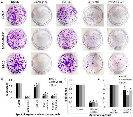 Proliferation of MCF-7, MDA-MB-231, and BT-20 cells 14 days after exposure to the various treatment conditions. (A) Representative plates of colonies formed in the various treatment conditions, stained with crystal violet. (B) Breast cancer cells exposed to a low dose of ESE-16 24 h prior to 4 Gy radiation showed significantly decreased long-term proliferation when compared to cells exposed to the individual treatments. Bars represent the mean fold changes of three biological repeats and STDs are represented by T-bars. p < 0.05 indicated with * compared to DMSO (Bi), the compound (Bii), or 4 Gy radiation only (Biii).