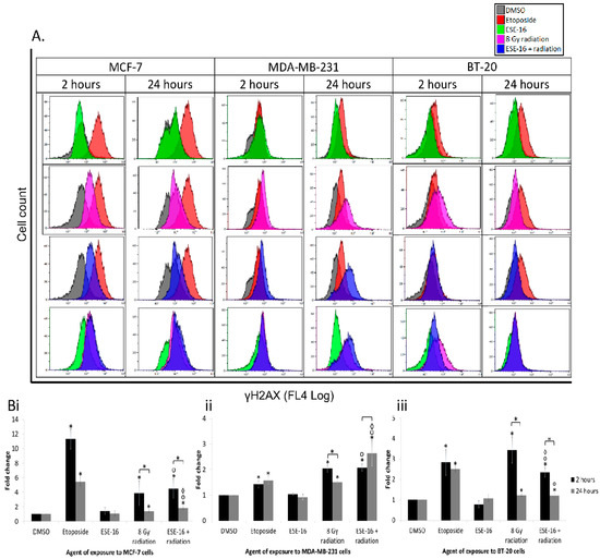 γH2AX detection in breast cancer cells in response to the different treatments. Histograms (A) were obtained 2 and 24 h after radiation by plotting cell count against γH2AX level. Overlay histograms displayed a right shift 24 h after radiation in MCF-7 and MDA-BM-231 cells exposed to the combination therapy. (B) Graphical representation of the above showed that exposure to 8 Gy radiation resulted in significantly higher γH2AX levels 2 h after radiation, which were partially restored 22 h later. This effect was diminished or lost in the combination-treated MCF-7 (Bi) and MDA-MB-231 (Bii) cells. Phosphorylation of H2AX was delayed at 2 h in BT-20 cells (Biii). Bars represent the mean fold increases of three biological repeats and STDs are represented by T-bars. p < 0.05 indicated with *compared to DMSO and 2 h versus (vs.) 24 h, ᵒ compared to ESE-16 drug control, and ◊ compared to the 8 Gy radiation control.
