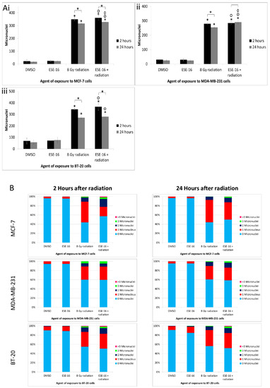 Graphical representation of micronuclei quantification in cells exposed to the various treatment conditions. (A) MCF-7 (i), MDA-MB-213 (ii), and BT-20 cells (iii) exposed to ESE-16 displayed no significant increase in the number of micronuclei at both time points. Exposure to 8 Gy radiation resulted in a significant increase in the number of micronuclei 2 h after treatment in all cell lines, which partially decreased over 24 h. MCF-7 and BT-20 cells treated with the combination displayed a similar pattern, although the number of micronuclei remained significantly increased in MCF-7 and MDA-MB-231 cells at 24 h. Bars represent the average number of micronuclei quantified per 500 binucleated cells for three biological repeats with the STDs represented by T-bars. p < 0.05 indicated with * compared to DMSO and 2 h vs. 24 h, ᵒ compared to the ESE-16 drug control, and ◊ compared to the 8 Gy radiation control. (B) Analysis of the distribution of micronuclei within cells exposed to the various treatment conditions showed that there was an increased number of micronuclei per cell in the combination-treated MCF-7 and MDA-MB-231 cells at 24 h compared to their radiation controls. Although the number of cells with DNA damage was not increased in the combination-treated samples, the severity of the DNA damage was amplified, as illustrated by the increased number of micronuclei per cell.