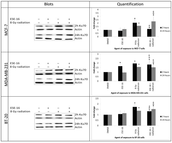 A significant increase in Ku70 levels was observed 2 and 24 h after 8 Gy radiation in MCF-7 (2.05 ± 0.51- and 1.60 ± 0.27-fold), MDA-MB-231 (1.95 ± 0.13- and 1.57 ± 0.17-fold), and BT-20 cells (1.72 ± 0.26- and 1.37 ± 0.17-fold) (Figure 7). Elevated Ku70 protein levels were also observed in MDA-MB-231 cells exposed to ESE-16 (1.65 ± 0.24-fold increase) at 2 h, although the rest of the data suggested that the drug did not increase Ku70 expression. The ESE-16/radiation combination treatment significantly amplified Ku70 expression 2 and 24 h after radiation in MCF-7 (1.13 ± 0.07- and 2.26 ± 0.78-fold), MDA-MB-231 (1.83 ± 0.45- and 1.53 ± 0.29-fold), and BT-20 cells (1.32 ± 0.08- and 1.53 ± 0.22-fold). Interestingly, Ku70 expression was decreased at 2 h after radiation in MCF-7 (0.58 ± 0.16), MDA-MB-231 (0.74 ± 0.11), and BT-20 cells (0.78 ± 0.11) exposed to the ESE-16/radiation combination treatment compared to the radiation controls. In contrast, Ku70 expression remained elevated, or even increased, at 24 h in MCF-7 (1.23 ± 0.08-fold), MDA-MB-231 (1.19 ± 0.10-fold), and BT-20 cells (1.11 ± 0.02-fold) in response to the combination treatment.