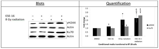 We observed that the medium from the drug control (which no longer contained ESE-16, see methods) marginally but significantly increased the expression of γH2AX in untreated BT-20 cells (1.21 ± 0.11-fold), while Ku70 expression remained unchanged (Figure 8). A statistically significant increase in γH2AX (2.08 ± 0.63-fold) and Ku70 (1.21 ± 0.03-fold) expression was observed in untreated BT-20 cells propagated in conditioned media obtained from the 8 Gy radiation control. BT-20 cells exposed to the conditioned media obtained from the ESE-16/radiation combination treatment revealed a 2.28 ± 0.53-fold increase in γH2AX levels and a 2.62 ± 0.24-fold increase in Ku70 expression when compared to the vehicle control. Furthermore, these cells displayed a significant increase in γH2AX and Ku70 expression when compared to cells cultured in the conditioned medium of cells exposed to the drug (1.67 ± 0.20- and 2.42 ± 0.67-fold increases, respectively) and 8 Gy radiation (1.34 ± 0.21- and 2.10 ± 0.18-fold increases, respectively) controls.