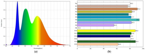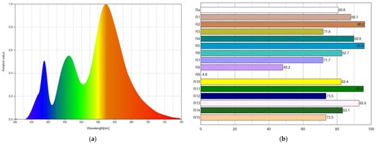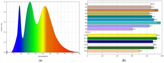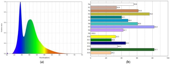 The spectral power distribution and CRI values of WLED15 are displayed in Figure 5. Similar to what occurs in WLED16 and WLED9, the wavelengths of emitted light expand to the whole visible spectrum, as depicted in Figure 5a, which accounts for the high CRI value achieved. The blue LED chip, Coumarin6, and Nile Red are again responsible for the three peaks in the SPD of WLED15. A short blue peak in the SPD results in a warm WLED (CCT of 2975 K). The CRI (Ra) parameter reaches a value of 80.6, as seen in Figure 5b.