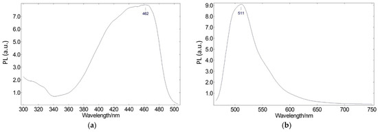 The selection of the photoluminescent materials was made according to the following criteria. First, we looked for a photoluminescent organic dye whose excitation spectral range overlapped with the emission spectrum of the chosen blue LED chip (see Figure 1). A molecule that satisfies this criterion is Coumarin 6. The excitation and emission spectra of Coumarin 6 dye embedded in EVA polymer are displayed in Figure 6. The visible excitation spectrum, as shown in Figure 6a, ranges from the ultraviolet to 500 nm, with an excitation peak at 462 nm, which is quite near to the blue LED’s emission peak. The blue LED + phosphor system’s emission range, as shown in Figure 6b, is extended compared with that of a pure blue LED chip, peaking at 511 nm.