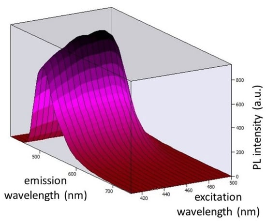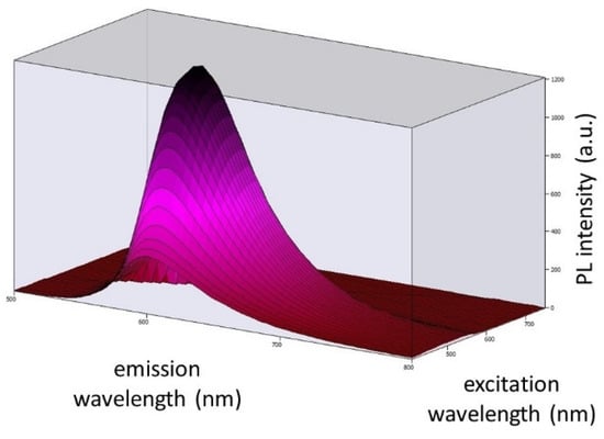 Three-dimensional photoluminescence spectra of Nile Red dye embedded in EVA polymer at excitation wavelengths ranging from 410 nm to 740 nm and emission wavelengths ranging from 500 nm to 800 nm.