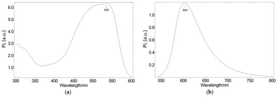Then, to further broaden the spectral range of the emitted light, we searched for a second photoluminescent organic dye. Nile Red has a wide excitation spectrum that may partially harness both the light released by the blue LED chip and the Coumarin 6 dye. The excitation and emission spectra of Nile Red dye embedded in EVA polymer are displayed in Figure 8. The visible excitation spectrum, as shown in Figure 8a, ranges from the ultraviolet to 600 nm, peaking at 535 nm and considerably overlapping with Coumarin 6′s emission spectrum. Regarding the emission spectrum (Figure 8b), there is a peak at 604 nm, enabling the generated light’s spectral range to be expanded even further.