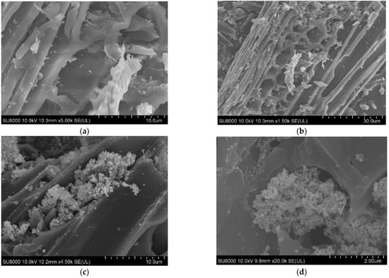 Biochar (BC) is a type of porous carbonaceous material that can be obtained through the pyrolysis of a variety of biomass of plants or animals under anoxic conditions [1,2]. It has attracted considerable attention in the remediation of hazardous pollutants in wastewater due to its extremely low cost and environmental friendliness. The conversion of various biomasses to BC has been reported in much of the literature [3,4,5,6], including activated sludge, animal manure, agricultural wastes, or carbonaceous sources such as bamboo, sawdust, and coconut shells. Currently, a large amount of agricultural waste is discarded every year, which poses a great challenge to the safe disposal and utilization of carbon-rich biomass residues.