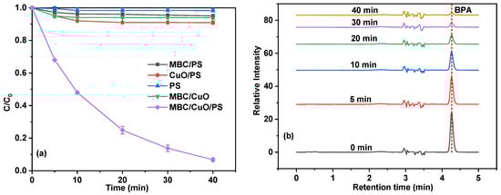The degradation kinetics of BPA were evaluated in different reaction systems along with time. As shown in Figure 2a, although PS is considered a strong oxidant, no obvious removal effect on BPA was observed in PS alone group, indicating that PS was not effective enough to oxidize BPA within 40 min [20]. It has been reported that BC can be used as adsorbent to remove BPA [21]. However, in the present study, the removal of BPA in the MBC/CuO system was only 6%, which means that adsorption ability of BC for BPA was very limited. On the other hand, although CuO and MBC can activate PS to degrade organic pollutants, which has been reported in much of the literature [22,23,24], the removal of BPA in MBC/PS and CuO/PS systems were only 5% and 9%, respectively. On the one hand, the catalytic activation performance of MBC was very limited. On the other hand, CuO particles tend to agglomerate together, resulting in the unsatisfactory catalytic performance. In contrast, the MBC/CuO/PS system exhibited much higher removal efficiency and up to 93% of BPA was removed. As seen in Figure 2b, in the MBC/CuO/PS system, the removal of BPA was very obvious, the peak intensity of BPA at the retention time of 4.25 min declined rapidly with the extension of reaction time. The kinetics of BPA degradation was well-fitted with the pseudo-first-order kinetics model and the rate constants (kobs) of BPA in the MBC/CuO/PS systems was 0.066 min−1 (Figure S3). The high activation ability of MBC/CuO might be attributed to the surface −OH groups bonded with CuO can accelerate PS activation and generate SO4•− through the rapid electron transfer between MBC/CuO and PS [20,24,25]. Furthermore, the introduction of MBC greatly enhanced the dispersion of CuO, which was conducive to the activation of PS. In order to further demonstrate the superior catalytic performance of MBC/CuO, the removal of BPA in the MBC/CuO/PS system was also compared with previous research results. As indicated in Table S3, compared with these selected catalysts, the kobs obtained in the present work was the largest (0.066 min−1) and the reaction time was the shortest (40 min), it could be concluded that MBC/CuO is an excellent catalyst for PS activation.