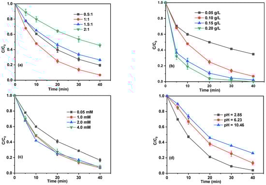 The influence of the mass ratio of CuO to MBC in the MBC/CuO composites on the degradation of BPA was explored, and the results were displayed in Figure 3a. In Figure 3a, the removal of BPA was 80%, 93%, 74%, and 55% when the mass ratio of CuO to MBC was 0.5:1, 1:1, 1.5:1, and 2:1, respectively, suggesting that a higher CuO to MBC mass ratio (>1:1) disfavored the degradation of BPA. The reason leading to these results can be explained by the fact that when the mass ratio of CuO to MBC exceeded 1:1, a large number of CuO particles could not be uniformly dispersed on the surface of MBC, most of the CuO particles were agglomerated together, and the active sites could not be fully utilized.