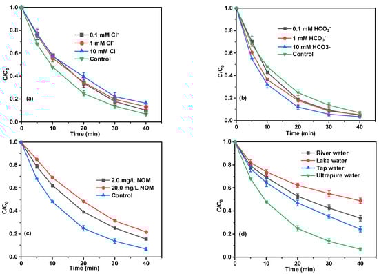 Along with reaction parameters, inorganic anions (Cl−, HCO3−) and NOM are widely existent in natural water and wastewater, which may interact with target pollutants and reactive species, having an significant impact on the reaction system [34]. As depicted in Figure 4a, the final BPA degradation efficiency gradually decreased from 93% to 90%, 87%, and 84% in the presence of 0.1, 1.0, and 10.0 mM Cl−, respectively. The suppression effect of Cl− was due to the fact that chloride ions with •OH and SO4•− and form radical species with lower redox potentials (Cl•, Cl2•−, and ClOH•−) using Equations (4)–(7) [35,36,37,38], thus decreasing the total degradation efficiency of BPA. Although Cl− showed a certain inhibitory effect, its degradation efficiency was still considerable. Figure 4b displayed the influence of HCO3− on the removal of BPA. Interestingly, we discovered that the presence of HCO3− had no significant negative effect on the removal of BPA, which was different from most of the previous reports [34,39,40]. In contrast, the degradation of BPA showed a weak promoting effect in the presence of HCO3−, this probable reason may be explained by the fact that PS can react with HCO3− to generation HCO4−, and the generated HCO4− could react with phenolic compounds directly though the single-electron abstract mechanism [41]. As shown in Figure 4c, the presence of various concentrations of NOM has a significant inhibitory effect on the removal of BPA. The degradation efficiency of BPA decreased to 87% and 78% within 40 min with increasing NOM concentration from 2.0 to 20.0 mg/L, respectively, indicating the inhibitory effect became more obvious with the increase of NOM concentration. This result could be reasonably explained by the fact that NOMs can act as radical scavengers due to the carboxyl groups and phenolic hydroxyls [42]. The negative effects of NOM on the degradation of organic pollutants by activated PS was also reported in other studies [43,44]. The catalytic performance of MBC/CuO/PS system for the removal of BPA in actual waters (river water, lake water, and tap water) was also explored and compared with that of ultrapure water. As depicted in Figure 4d, the removal efficiency of BPA in the river water, lake water, and tap water was only 66%, 51%, and 76%, respectively, which were much lower than that in ultrapure water (93%). The obvious inhibition in TW and RW can be explained by the presence of relatively high TOC and Cl− in actual water (Table S6), which could consume free radicals [45,46].