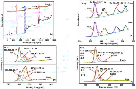 The element compositions and binding states of the fresh and used MBC/CuO were analyzed using XPS. The survey spectra indicated that only C, O, and Cu on the surface of fresh and used MBC/CuO and no obvious change in the peaks intensities of these elements could be observed between the fresh and the used MBC/CuO (Figure 5a), indicating that the catalyst has good stability. High-resolution XPS of Cu 2p were displayed in Figure 5b, the peaks centered at 943.1 eV and 954.0 eV could be attributed to the Cu 2p3/2 and Cu 2p1/2, and the two satellite peaks located at about 942.41 and 962.64 eV could be seen, which were the characteristic signal peaks of Cu2+, indicating the presence of CuO in the catalyst. After the degradation reaction, the copper species in the MBC/CuO remained in the Cu (II) state, which may be because the formed Cu (III) was too unstable to be detected [47,48]. For XPS spectra of O 1s (Figure 5c), the peaks located at 530.01, 531.60 and 532.80 eV, which were assigned to the bonding of lattice oxygen (OI) with metal cations, −OH groups (OII), and the adsorbed H2O (OIII) on the MBC/CuO surface, respectively [49]. After the degradation reaction, the area of OII and OIII increased with the decrease in OI, implying the surface of MBC/CuO was hydroxylated during the degradation reaction, which was consistent with previous results [13]. The high-resolution XPS spectra of C1s were also investigated in Figure 5d, which could be attributed to C=C, C–C, C–H (284.85 eV); C–OH (285.81 eV); and COOH (288.61 eV), respectively [50]. The peak area of C–OH and COOH decreased in the used MBC/CuO, indicating that C–OH and COOH were converted to CO▪ and COO▪ using Equations (8) and (9), and became participate during the activation of PS [51].