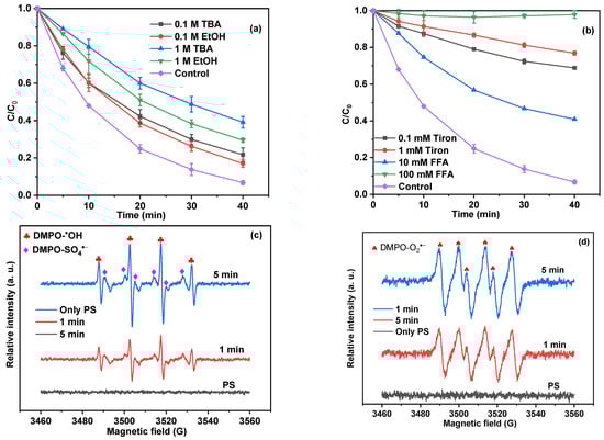 To elucidate the contribution of reactive species on the removal of BPA in the MBC/CuO/PS system, EtOH, TBA, tiron, and FFA were added to the reaction system for radical quenching experiments, and the results are depicted in Figure 6. EtOH could be used as SO4•− and •OH scavengers, TBA was often used as a quencher of •OH radical, and tiron was used to quench O2•− [52,53], FFA could be used to probe the 1O2. As depicted in Figure 6a, when different concentrations of EtOH and TBA were introduced, it could be observed that the removal of BPA decreased to different degrees, and the inhibition effect was enhanced with the increase of scavenger dosage. The results indicated that both SO4•− and •OH contributed to the degradation pathways in the MBC/CuO/PS system. It should be noted that stronger inhibition was always achieved when TBA was introduced whether at a low concentration (0.1 M) or high concentration (1.0 M), which was inconsistent with most of the reported results [54,55]. This result might be caused by the masking effect of the high viscosity of TBA on the bonding sites dispersed on the catalyst surface [42,56]. As shown in Figure 6b, with the increase in tiron concentration level to 0.1 mM and 1.0 mM, the removal of BPA decreased to 31% and 23%, respectively. In addition, when the FFA concentrations were increased from 10.0 to 100.0 mM, the degradation efficiencies for BPA dropped to 59% and 2%, respectively. These results indicated that a more remarkable inhibition effect of tiron and FFA could be accomplished; thus, O2•− and 1O2 might play a key role in PS the degradation processes.