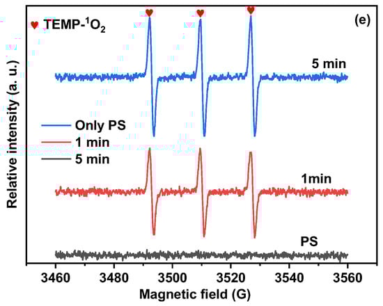 Effects of EtOH and TBA dose on BPA removal (a); effects of FFA and tiron dose on BPA removal (b); DMPO spin-trapping ESR spectrum of •OH/SO4•− (c) and 1O2 (d); as well as TEMP spin-trapping ESR spectrum of 1O2 (e). ((MBC/CuO) = 0.1 g/L, (DMPO) = (TEMP) = 100 mM, (PS) = 1 mM, T = 25 °C).
