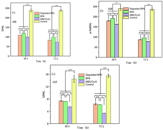 The concentration of total protein homogenate in hemolymph, the enzyme activity of SOD (a), GSH (b), and CAT (c) in control, MBC/CuO, degraded BPA, and BPA treatment groups, respectively, calculated based on the total protein homogenate in hemolymph. Error bars depict the mean ± SD, n = 3. n.s. is the abbreviation for no significance, * p < 0.05, ** p < 0.01, *** p < 0.001.