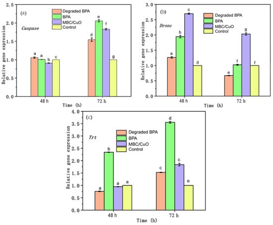 As shown in Figure 8a, the situation is similar to body mass, degraded BPA, and BPA, and MBC/CuO did not change the expression of the Caspase gene after 48 h exposure when compared to control. However, the expression of Caspase gene was enhanced by the three treatments after 72 h, which suggested that the BPA compound is a potent genotoxicant and triggers cell death. Fortunately, the cell death was reduced when the materials was added in BPA system. It seems that the use of MBC/CuO at considerable levels may have reduce the sensitivity of the genotoxicity with BPA in this study. Dronc gene expression was induced by BPA in this study and is consistent with the caspase activity test. The elevation of the Dronc gene levels was evidenced in degraded BPA and MBC/CuO treatments as compared with that in control groups after 48 h exposure. The levels of this gene in MBC/CuO treatment were about 2.8 times and 1.5 times higher than that in the control and BPA groups, respectively. Surprisingly, as shown in Figure 8b, BPA induces concentration-dependent Dronc gene response, and this effect was completely mitigated by MBC materials in the degraded BPA system, in consistency with the role in the caspase test, although the toxicity of MBC materials alone is still relatively high against nontarget organism silkworms. Another gene (Trt) related to apoptosis was also observed in the present study. As indicated in Figure 8c, BPA started to induce the gene expression of Trt after 48 h, which was 2.5 times higher than that in control groups. At the 72 h condition, the Trt levels were even increased to 3.5 times, but MBC materials inhibited the gene overexpression in the degraded BPA group, which demonstrated a blocking effect. Cell apoptosis is a natural process that allows organisms to self-protect in the event that they become exposed to potentially harmful substances. This innate ability allows organisms to eliminate potentially harmful substances and repair damaged cells. Apoptosis is a process that involves many genes in cells. One of these is the Dronc gene, which is a promoter gene associated with cell apoptosis and is dependent on the caspase pathway. Dronc is also known as the key effect in apoptotic cells [67]. The integrated enzyme reactions are triggered when active cys-teinyl aspartate specific proteinases are present. This results in the eventual disintegration of DNA that is located on chromosomes and even cells following exposure of BPA, the expression of the important apoptosis-relevant genes Dronc and Caspase increased, indicating that these genes were activated by the BPA. This was demonstrated by their overexpression in comparison to the control group. Our findings confirmed this activation (Figure 8c). Telo-merase reverse transcriptase (Trt) is more closely associated with growth than it is with apoptosis, and it was also induced by MBC materials. This was reflected by an increased expression in the treatments exposed group and a decreasing expression trend throughout the exposure time. Based on the above results, compared with the original BPA solution, the final BPA solution treated with MBC/CuO/PS system was significantly less toxic to silkworms.