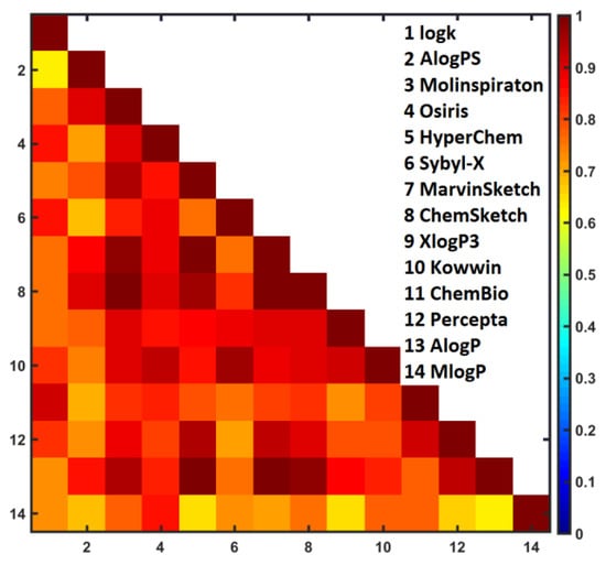 Matrix of correlation coefficients of linear relationships between experimental lipophilicity (logk) and calculated lipophilicity (clogP) using different programs.
