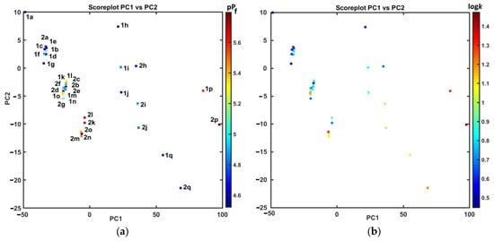Projection of 4-chlorocinnamanilides 1a-q and 3,4-dichlorocinnamanilides 2a-q on plane defined by PC1 and PC2 color-coded with antiplasmodial activity in logarithmic scale (a) and experimental lipophilicity (b).