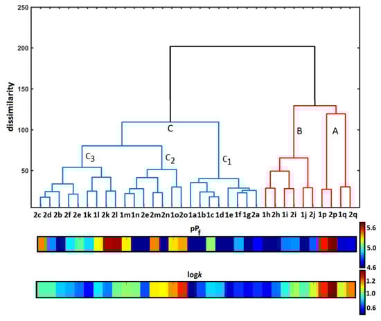 Dendogram of molecules 1a-q and 2a-q in descriptor-based space with color-coded map of biological and lipophilic data in logarithmic scale. Clusters are marked by capital letters.