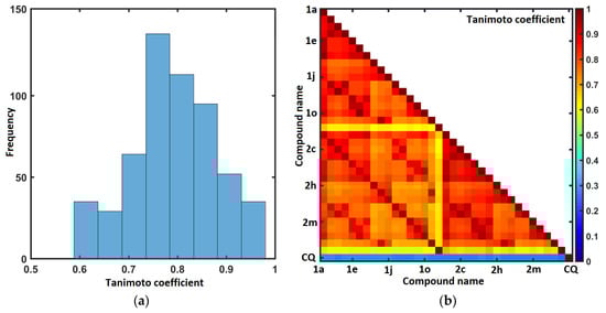 Distribution of Tanomoto coefficients (a) and triangular matrix of Tanimoto coefficients (b) for 4-chlorocinnamanilides 1a-q and 3,4-dichlorocinnamanilides 2a-q compared to chloroquine (CQ).
