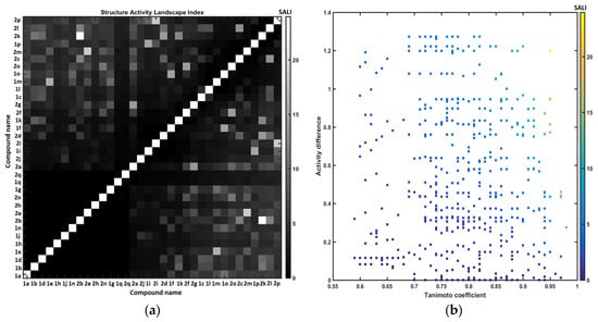 Gray-scaled SALI plot with molecules ordered by increasing antiplasmodial activity (a) and corresponding neighboring plot (b) for 4-chlorocinnamanilides 1a-q and 3,4-dichlorocinnamanilides 2a-q.