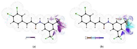 The hydroxyl group of Thr337 residue was indicated to be potentially hydrogen-bonded (as hydrogen donor) with the amide nitrogen (as hydrogen acceptor) of the most active inhibitors 2p and 2l, respectively. Interestingly, the fluorine substituent (alone or in trifluoromethyl group) in N-phenyl ring seems to play a key role in forming the halogen bonds (see Figure 9b,c). Overall, the halogen bonds (or X-bonding) have become recognized recently as potential stabilizers of the inter-/intra-molecular interactions that contribute significantly to recognition specificity of the halogenated molecules (or halogen-containing metabolites), usually used as inhibitors against the biomedically important targets [69,70]. De facto, two electrostatically driven, highly directional and short halogen–oxygen interactions were specified between fluorine of –CF3 substituent in the most potent molecule 2p and the proximal oxygen atoms of the carboxyl functional group in Asp272 residue. A similar X-bonding was recorded for the active inhibitor 2l, where directly attached to N-phenyl ring fluorine atom interacts with one hydroxyl oxygen of Ser229 amino acid residue.