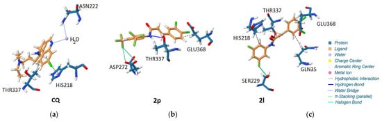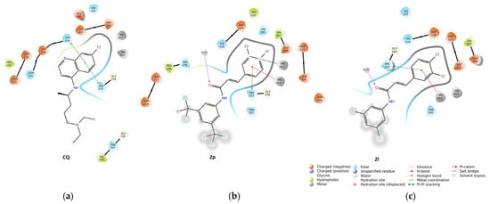 Planar ligand interaction diagram for chloroquine (a) and the most potent inhibitors 2p (b) and 2l (c) generated by Maestro program.