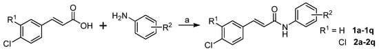 Synthesis of (2E)-3-(4-chlorophenyl)-N-arylprop-2-enanilides (1a-1q) and (2E)-3-(3,4-dichlorophenyl)-N-arylprop-2-enanilides (2a-2q). Reagents and conditions: (a) PCl3, chlorobenzene, MW, 40 min [26].