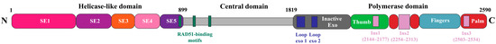 POLQ-like genes are widely represented among multicellular eukaryotic organisms, including plants and protists. However, among fungi, including yeast, POLQ-like genes are not identified [9]. Human Pol θ is a 290 kDa protein which consists of 2590 amino acid residues arranged in three domains (Figure 1).