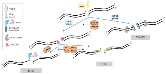 Several factors favoring the cell choice of TMEJ have been defined. The main regulation is most likely realized during the first step—resection, when the 3′-ssDNA overhangs are generated by the MRE11–RAD50–NBS1 (MRN) complex and CtBP-interacting protein (CtIP) [7]. The formation of such intermediates, which are unsuitable substrates for the c-NHEJ Ku factors, antagonizes this pathway and favors HR and TMEJ. The phase of the cell cycle, the presence of some regulatory and cell-signaling proteins, and the length and degree of homology of the processed 3′-overhangs appear to be the main factors in the Pol θ recruitment and cell’s choice of TMEJ over c-NHEJ, HR and SSA (Figure 2) [23,24,25,26,27,28,29]. TMEJ, together with HR and SSA, are limited to the S and G2 stages, while c-NHEJ operates predominantly in the G0/G1 phases [29].