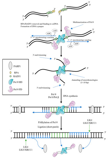 Model of TMEJ. The resected 3′-overhangs are coated by RPA and RAD51 filaments. The HD of Pol θ removes both of them in ATP-dependent manner, contributing to TMEJ. Multimerization of Pol θ promotes the DNA synapse formation and initiates the 3′→5′ bidirectional searching for microhomologies, using the energy of ATP hydrolysis. Aligned 3′-ends are annealed in microhomology-rich regions. Unannealed 3′-overhangs are trimmed before DNA extension. Pol θ (or Pol β) fills gaps from annealed microhomologies, using them as primers. PARP1 PARylates Pol θ in order to remove the polymerase from DNA and complete the synthesis step. LIG1 or LIG3/XRCC1 complex finish the end joining (the short-patch resolution is shown).