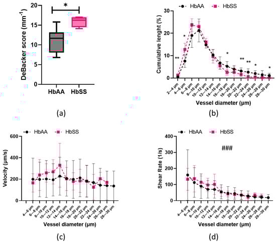 The De Backer Score was higher (p < 0.01) in the HbSS subjects compared to the HbAA subjects (Figure 1a). The analysis of variance indicated that the distribution of the vessel diameters was different between the HbAA and HbSS groups (Figure 1b; p < 0.05). The HbSS volunteers had a higher number of vessels with diameters < 6 µm than the control volunteers (p < 0.05). In contrast, the HbAA group exhibited a significantly higher proportion of vessels > 16 µm (p < 0.05). The greatest proportion of microvessels in the HbSS group was in the 6–8 µm range, while it was in the 8–10 µm range for the HbAA group. Then, we analyzed the blood flow velocity (Figure 1c) and shear rate (Figure 1d) values in the two groups. Because the velocities were sporadically detectable in the smallest vessels (2–4 µm), this vessel group was removed from the analysis due to a lack of available data. Notably, in 93 ± 11% of the analyzed sites, no 2–4 µm vessels were flowing in the HbSS group compared to 70 ± 23% in the HbAA group (p = 0.22). The velocities of the HbSS and HbAA individuals were not significantly different (p = 0.104). The shear rate of the two groups decreased as the vessel diameter increased (p < 0.001) and tended to be slightly higher in the HbSS group than in the HbAA group (p = 0.054), notably so in the smallest vessel sizes ranging from 6 to 14 µm.