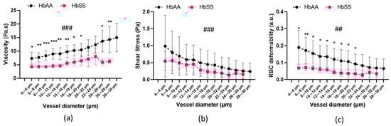 The viscosity in the HbSS volunteers was determined to be significantly lower than that in their HbAA counterparts (p < 0.001) across almost all the vessel diameters with a detailed distribution outlined in Figure 2a. Because the shear rate decreased when the vessel diameters increased, the blood viscosity increased from the smallest to the biggest vessels in the two groups (p < 0.001). No significant difference was found when comparing the shear stress across the vessel diameters of the HbAA group with that of the HbSS group (Figure 2b; p = 0.118). The magnitude of the changes in the shear stress between the smallest and the biggest vessels was comparable between the HbAA group (74.3% decrease in the 4–6 µm and 26–28 µm categories) and the HbSS group (71.3% decrease in the 4–6 µm and 26–28 µm categories). Figure 2c shows the changes in local RBC deformability across all the vessel diameters in the two groups. RBC deformability was higher in the healthy volunteers compared to the HbSS individuals for the vessel diameters ranging from 4 to 22 μm. Moreover, the increase in RBC deformability between the biggest and the smallest vessels was higher in the HbAA group than in the HbSS group, where RBC deformability remained very low (less than 0.1 a.u.).