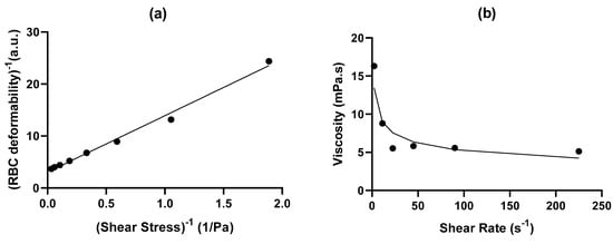 Example of curve fitting for a volunteer with sickle cell anemia (HbSS) with (a) Lineweaver–Burke relationship, i.e., inverse deformation as a function of inverse shear stress leading to the personalized function presented in Equation (1), and (b) viscosity as a function of the shear rate fitted with power law (Equation (2)).