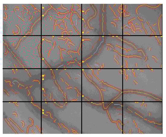 The De Backer score is a measurement of the vessel density and is determined by counting the number of vessels crossing arbitrary horizontal and vertical lines [] as shown in Figure 4. It is calculated by dividing the number of vessels crossing the line by the length of the line.