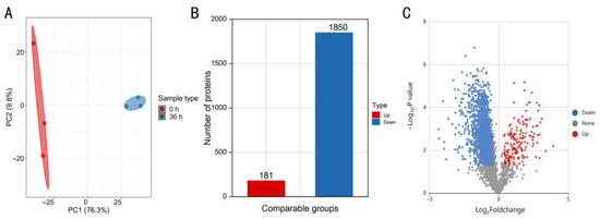 Overview of protein identification and sample repeatability test. (A) Principal component analysis (PCA) showed quantitative sample repeatability, (B) histogram of the protein number distribution of differentially expressed proteins (DEPs) in different comparison groups, and (C) volcano plot of DEPs in the groups being compared (|log2 Fold Change| > 1.3 and p < 0.05).