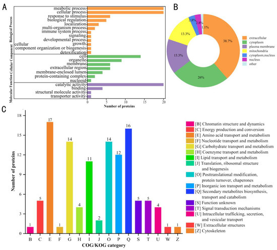 Classification of upregulated proteins. (A) Gene ontology (GO) functional classification, (B) subcellular locations, and (C) clusters of orthologous groups (COG) showing functional classes.