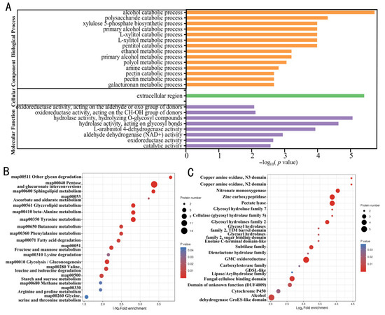 The GO enrichment analysis showed that upregulated proteins were mainly enriched in terms of alcohol decomposition, polysaccharide decomposition, primary alcohol decomposition, pentose alcohol decomposition, and L-xylitol metabolism. Furthermore, the cellular components were significantly enriched in the extracellular regions, and molecular function enrichment was observed mainly in hydrolase activity, hydrolytic O-glycosyl compounds, and oxidoreductase activity (Figure 3A). Consistently, the Kyoto Encyclopedia of Genes and Genomes (KEGG) metabolic pathway analysis showed that 100 upregulated proteins were involved in 18 pathways, among which, the most significantly main enriched ones were pentose and glucuronate interconversions (map00040), tyrosine metabolism (map00350), and glycolysis/gluconeogenesis (map00010) (Figure 3B, Table 2 and Table S3). The protein domain enrichment results showed that 67 upregulated proteins were enriched in different domains, of which the most enriched domains were GMC oxidoreductase, alcohol dehydrogenase GroES-like domain, and pectate lyase (Figure 3C, Table 3 and Table S4).