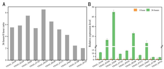 A quantification of the mRNA expression levels of the upregulated V. dahliae proteins in the infected potato plants at 0 and 36 h post-inoculation of conidia was performed by qRT-PCR, for which, the following 10 upregulated proteins were randomly selected: VDAG_10194, VDAG_02304, VDAG_10208, VDAG_07442, VDAG_09254, VDAG_08248, VDAG_07373, VDAG_03665, VDAG_01700, and VDAG_09741. Basic information describing these proteins and primers used for qRT-PCR verification are listed in Tables S1 and S6, respectively. Consistent with proteomic data obtained from TMT quantification, the mRNAs of all 10 proteins were more upregulated at 36 h compared to those at 0 h (Figure 4), demonstrating the reliability of the proteomic analysis.