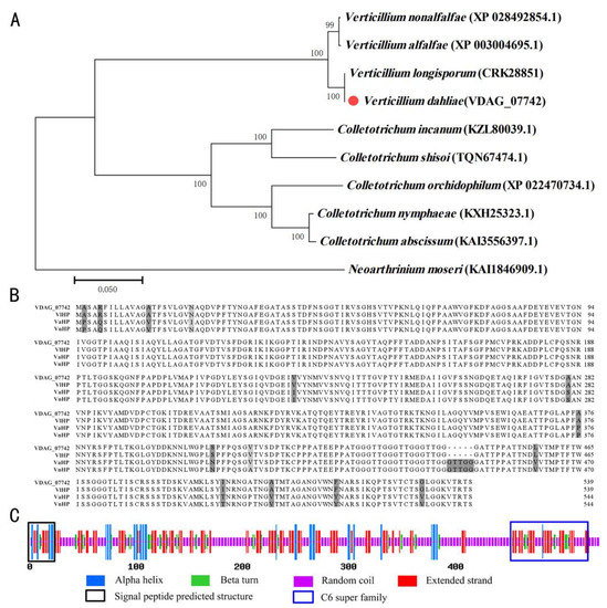 The gene sequence of VDAG_07742 was amplified using the genomic DNA of V. dahliae wild-type (WT) strain JY, and it was 100% identical with that of the V. dahliae VdLs.17 in the JGI (https://genome.jgi.doe.gov/ (accessed on 8 January 2023)) database. The VDAG_07742 protein with 530 amino acids, which is a non-GPI-anchored protein that contains a signal peptide at the position associated with fragment 1–23 and located in the extracellular space without a transmembrane domain, additionally, it contains a C6 super family domain at fragment 455–527 (Figure 5C). The predicted secondary structure of the protein contained an alpha helix (9.46%), a beta turn (7.98%), random coils (54.17%), and extended strands (28.39%; Figure 5A).