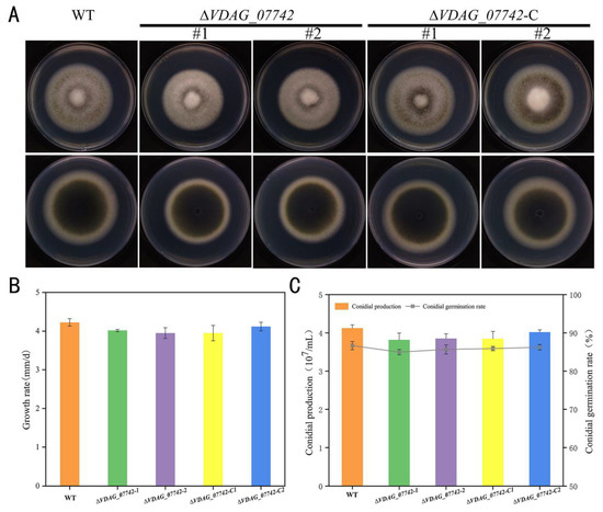 To clarify whether VDAG_07742 plays a role in V. dahliae vegetative growth, two VDAG_07742 deletion mutants (ΔVDAG_07742-1 and ΔVDAG_07742-2) and two VDAG_07742 complementary mutants (ΔVDAG_07742-C1 and ΔVDAG_07742-C2) were used for further study after the genetic transformation and PCR verification (Figure S1) [3,19,20]. Following cultivation on a PDA medium for 10 d, both of the knockout mutants showed the same colony morphology and color as those of the WT strain and complementary mutants (Figure 6A). Furthermore, no significant differences were observed between the mutants and WT in the colony growth rate, conidial production, or spore germination (Figure 6B,C).