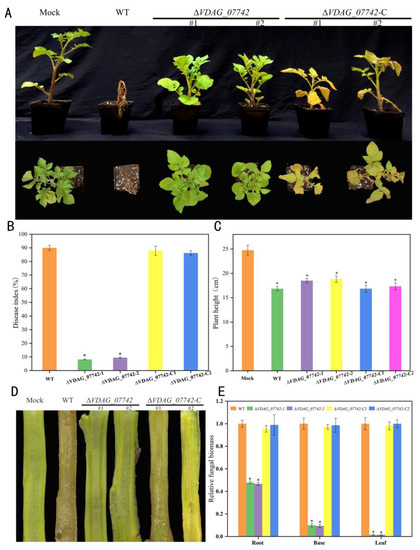 To investigate the role of VDAG_07742 on V. dahliae pathogenicity, V. dahliae-susceptible potato cultivar “Favorita” was used for inoculation [21]. The V. dahliae WT strain and mutants were inoculated into potato seedlings at the six-leaf stage using the dipping root method [22]. Four weeks after inoculation, the plants inoculated with the WT strain showed obviously wilt symptoms, whereas those inoculated with mutants or the mock ones did not, and the complementary mutants caused more severe chlorosis of typical wilt symptoms than the deletion mutants did (Figure 7A). The disease index results show that the deletion mutants caused a significantly less severe wilt disease (Figure 7B), and the heights of the potato plants infected with the V. dahliae strains were less than the mock plants were, but no difference was detected between these strains (Figure 7C). No discoloration was observed in the vascular vessels of the plants infected with the deletion mutants, which appeared to be similar to the mock plants. In contrast, discoloration was evident in the WT strain and the complementary mutants (Figure 7D). The qRT-PCR results further confirmed that the biomass of deletion mutants was significantly lower than those of the WT or complementary mutants in the root, base, or leaf tissues (Figure 7E), indicating the colonization of V. dahliae was defective without the gene VDAG_07742. In addition, the expression of VDAG_07742 in the early infection process in the WT strain was significantly induced (Figure S2). Therefore, the results above indicate that VDAG_07742 is required for the pathogenicity of V. dahliae in potatoes.