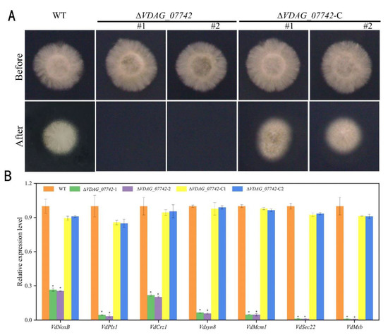 As a defective colonization was observed in the deletion mutants, considering that the vegetative growth was not affected by VDAG_07742 in V. dahliae, we hypothesized that the penetration of VDAG_07742 deletion mutants could be deficient. In order to detect the penetration ability, WT and mutant conidia were inoculated on PDA plates coated with cellulose membranes following the previously described method [23]. The removal of the cellulose membranes 3 d after inoculation and further culturing for 5 d rendered the knockout mutants unable to penetrate the cellulose membranes in the same manner as they did in the WT strain, while the penetration ability of the complementary mutants was restored (Figure 8A), indicating that the deletion of VDAG_07742 damaged the ability of V. dahliae to penetrate the cellulose membranes. Previous studies showed that VdNoxB, VdPls1, and VdCrz1 are essential for V. dahliae penetration [22,24], and our qRT-PCR results show that the expression of these genes was significantly reduced in the knockout mutants (Figure 8B). Further, the expression levels of the attachment-related genes VdMsb and VdMcm1 [25,26] and the secretion-related genes VdSec22 and VdSyn8 [27] were also downregulated in the knockout mutants (Figure 8B). Altogether, these results indicate that the penetration ability of the knockout mutants was hampered compared to that of the WT fungal strain, and this effect was due to a reduced expression of penetration-related genes, while the attachment and secretion related genes were positively regulated during infection.