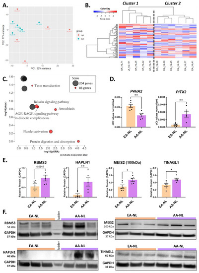 Differential expression analysis between AA-NL and EA-NL. (A) PCA plot for “AA-NL vs. EA-NL” DE analysis. (B) Heatmap of the genes with a q-value < 0.1 in the “AA-NL vs. EA-NL” DE analysis. (C) Perturbation vs. over-representation pathway plot. Dots representing the top 6 impacted pathways are positioned by their p-values from two different analyses: the impact analysis (pAcc) vs. the over-representation analysis (pORA). The size of each plot denotes the total number of genes in the corresponding KEGG pathway (for visualization, this number is log(2) scaled). (D) Expression levels of P4HA2 and PITX2 in AA-NL fibroblasts compared to EA-NL fibroblasts. (E) Protein abundance of RBMS3, HAPLN1, MEIS2 (100 kDa band), and TINAGL1 in AA-NL fibroblasts compared to EA-NL fibroblasts, normalized to GAPDH loading control. (F) Representative Western blots for each protein mentioned in panel (E). For MEIS2, three bands were visible at 60, 65, and 100 kDa, but only the 100 kDa band showed a significant difference in intensity. Unpaired Student’s t-Test, * p ≤ 0.05, ** p ≤ 0.01. Mean ± SEM.